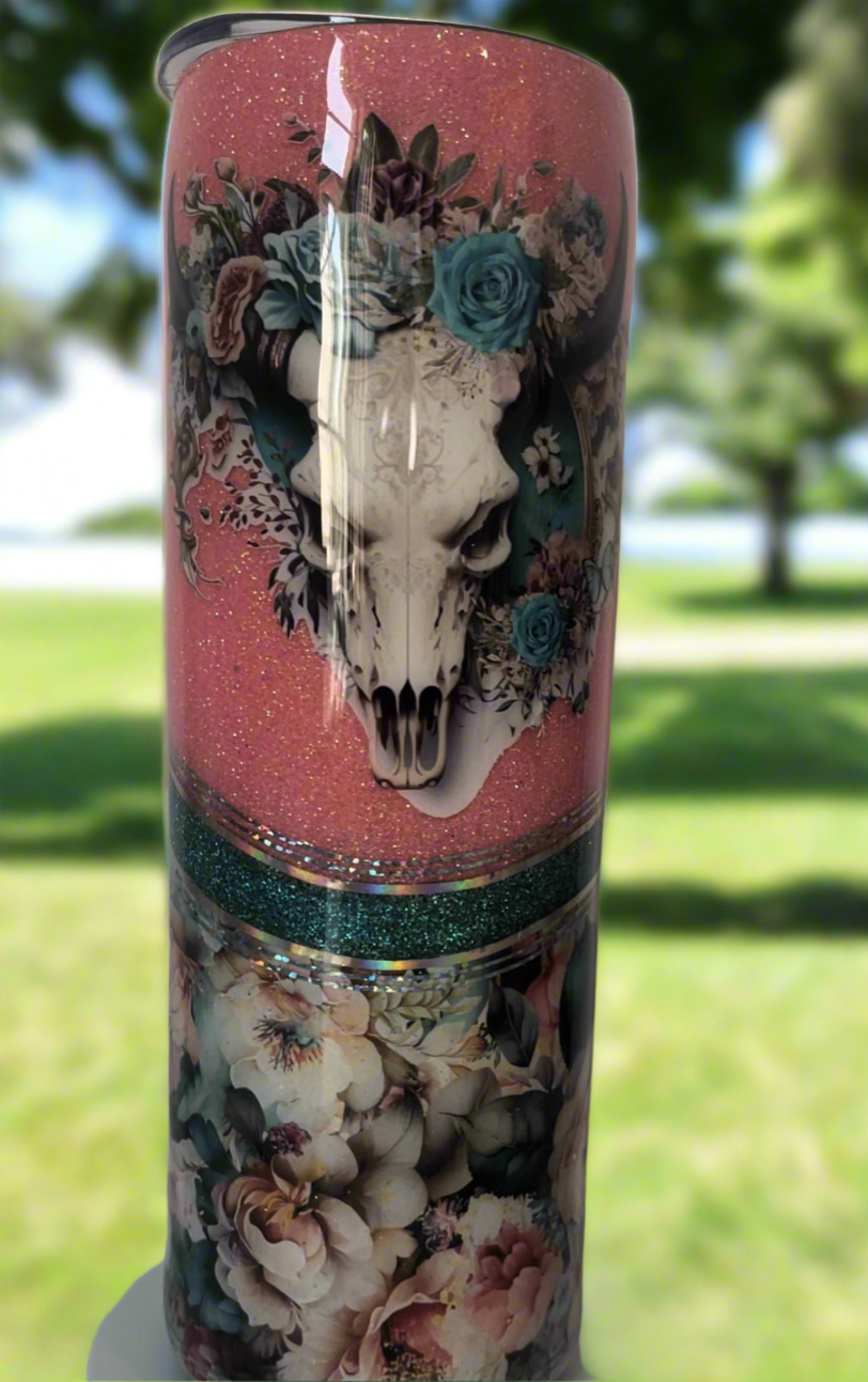 30oz Glitter Tumbler-Floral Cow Skull